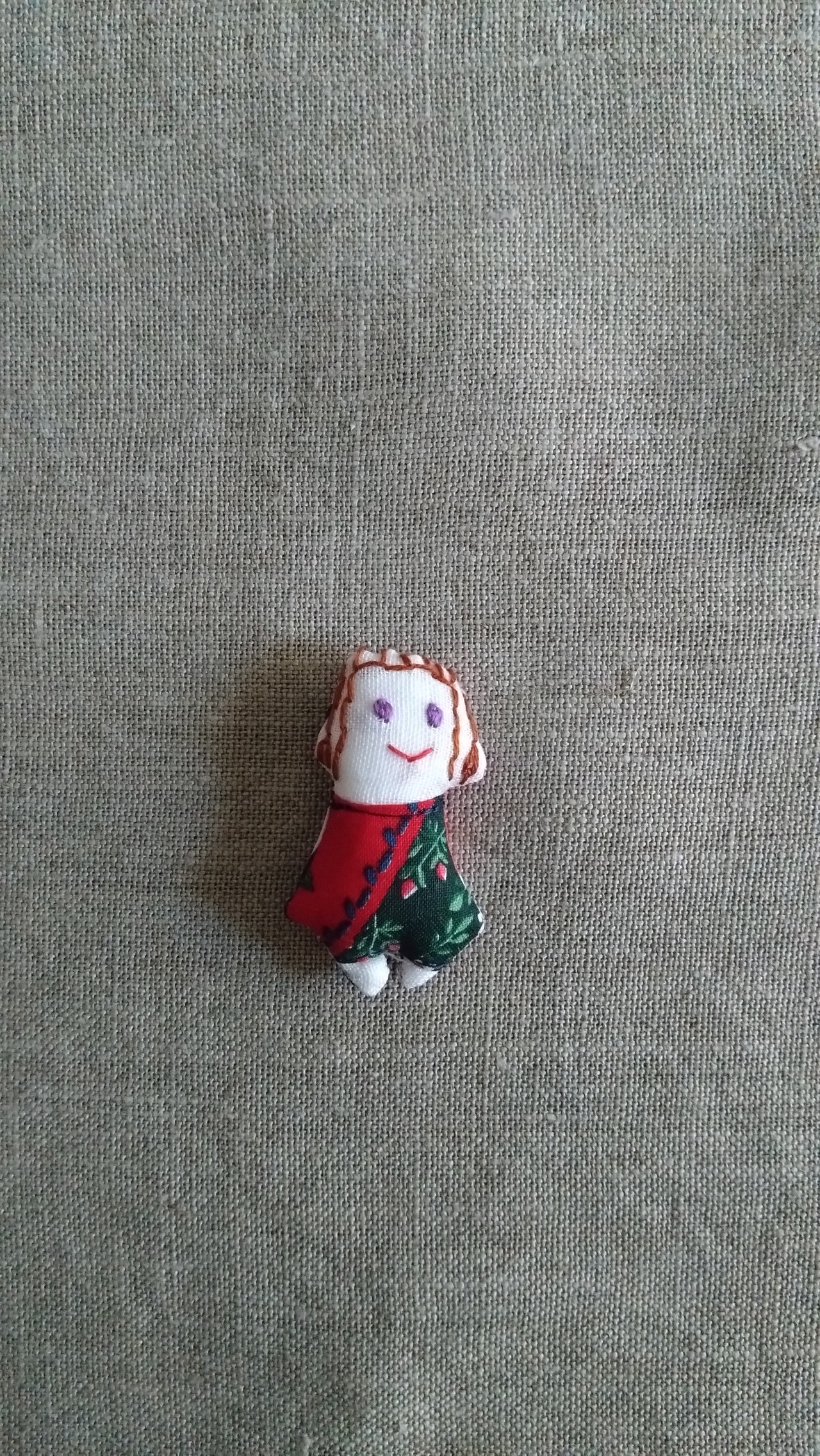 顔に手刺繍を施したミニサイズのお人形。ブローチになっています。 長さ 約5cm