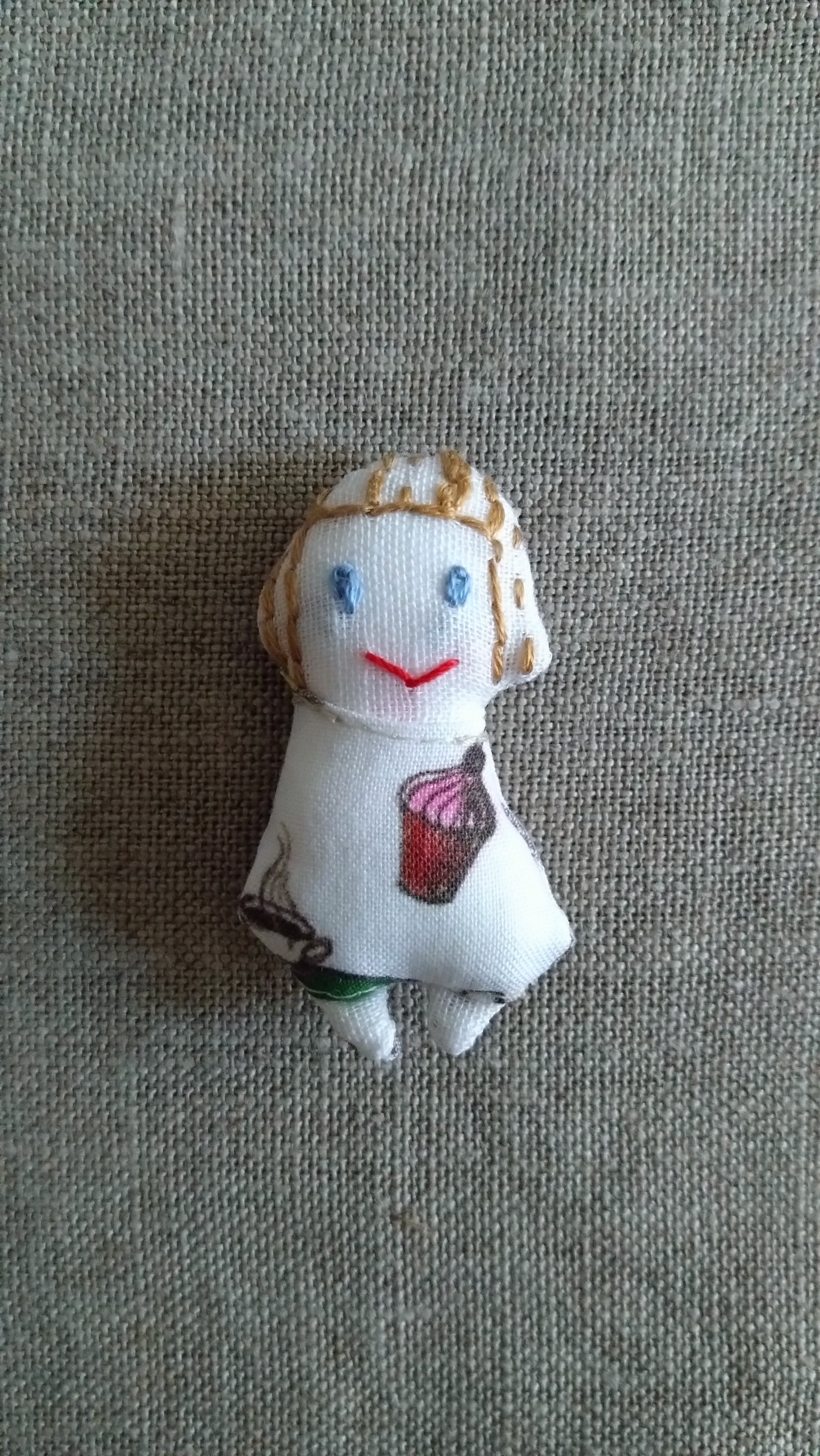顔に手刺繍を施したミニサイズのお人形。ブローチになっています。 長さ 約5.5cm