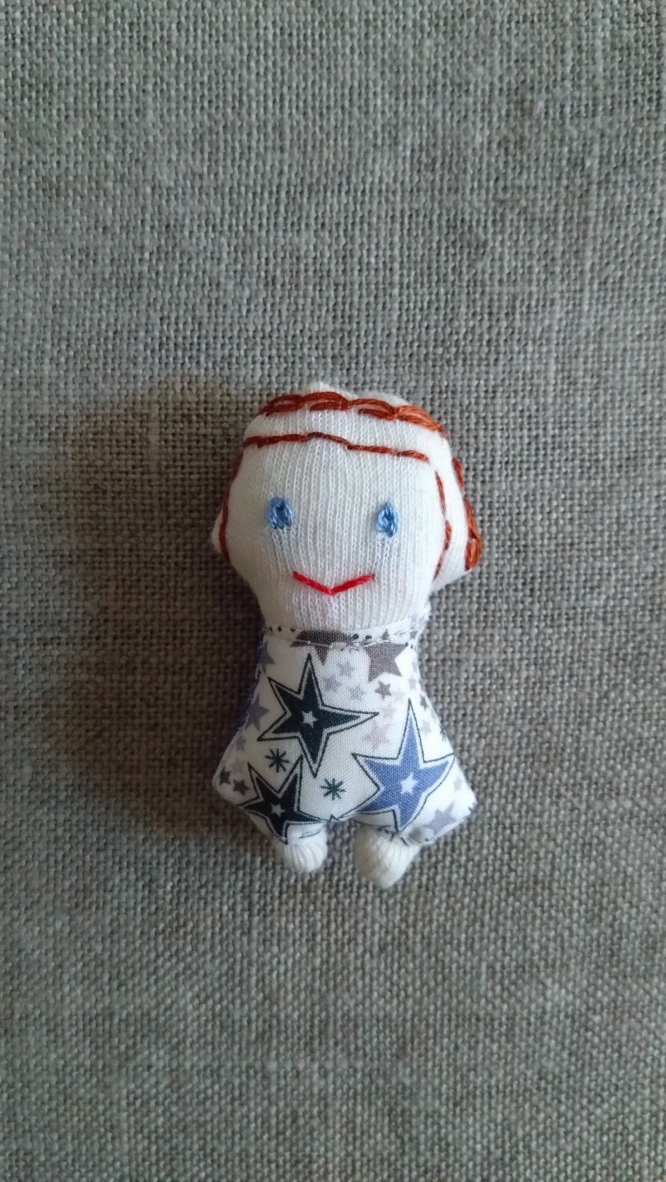 顔に手刺繍を施したミニサイズのお人形。ブローチになっています。 長さ 約5.5cm