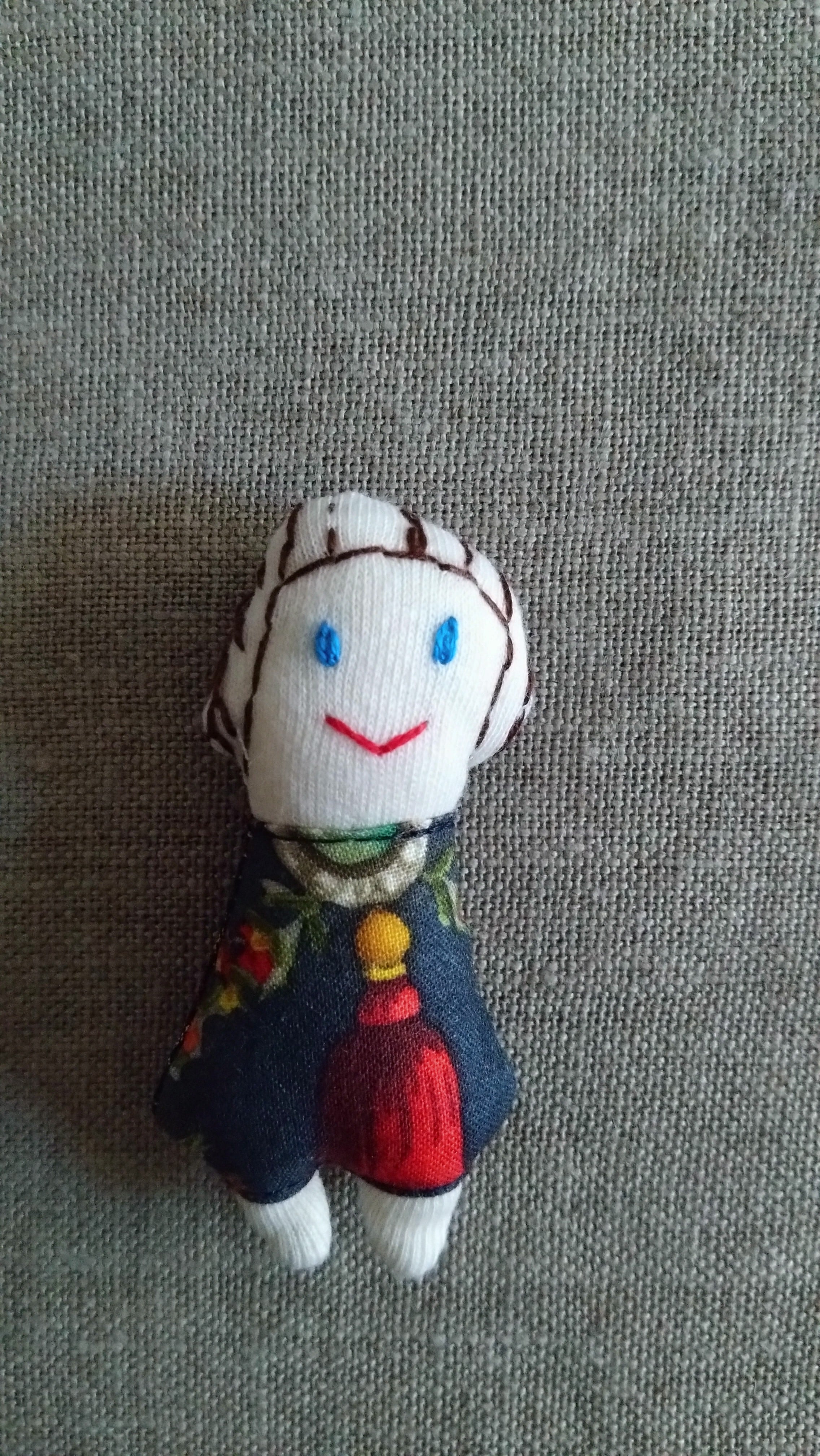 顔に手刺繍を施したミニサイズのお人形。ブローチになっています。 長さ 約7cm