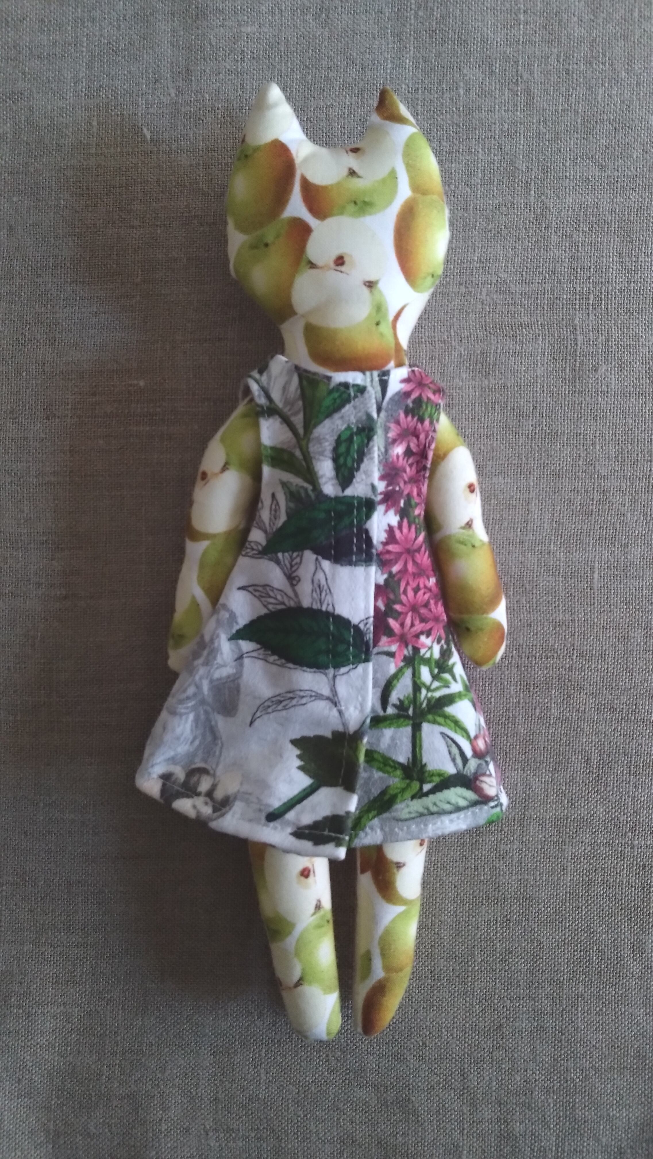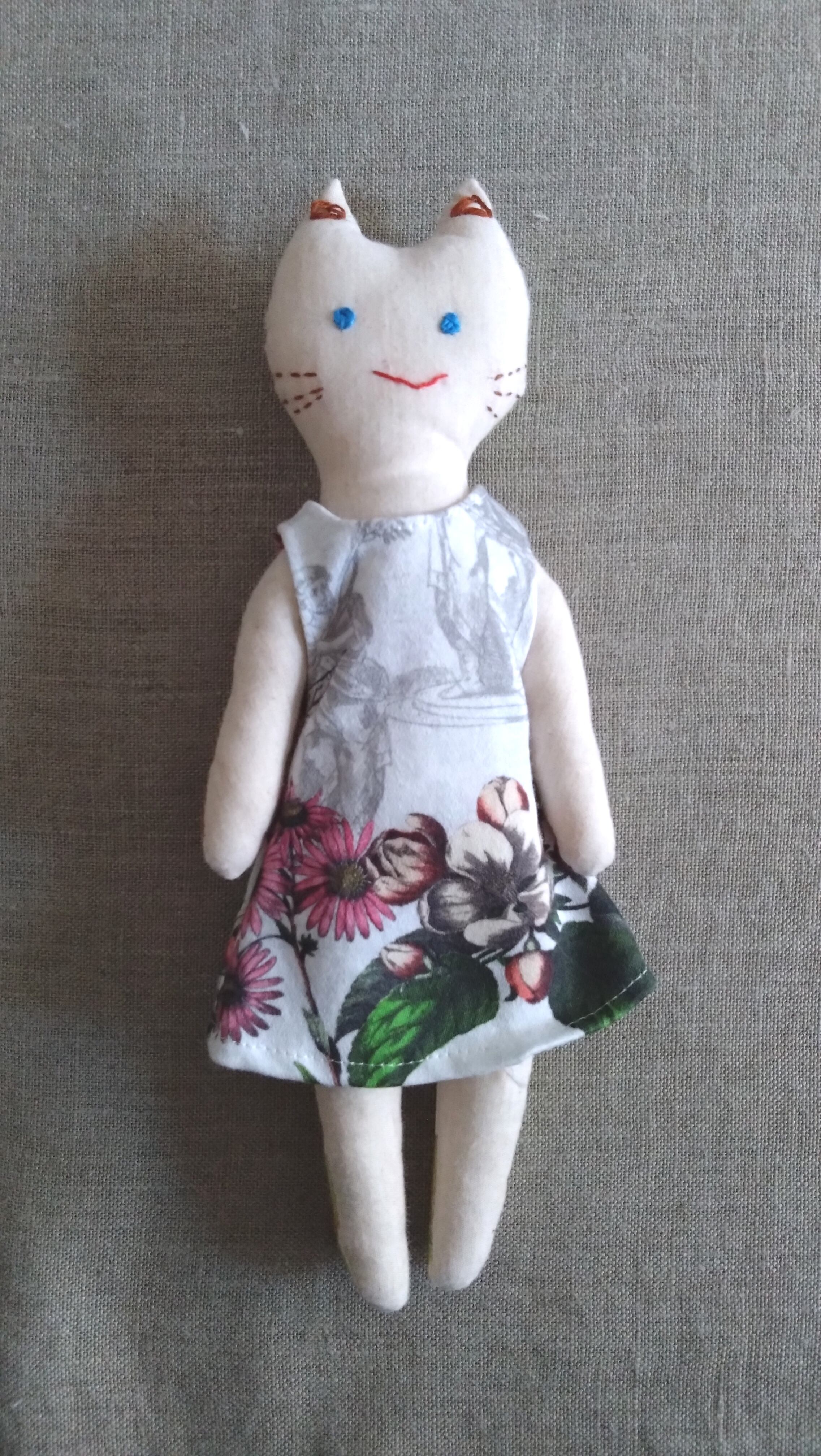 顔と下着に手刺繍を施したねこのお人形。着せ替えできます。 長さ 約25cm